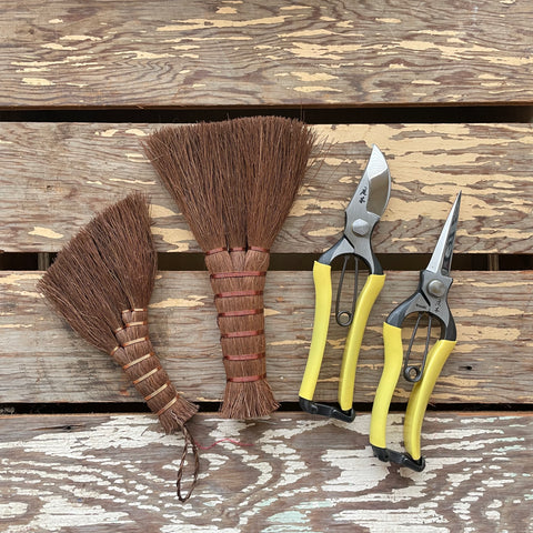 Japanese hand broom for all your little gardening messes and delicate tidying jobs - cleaning up the rims of containers after potting up, sweeping debris off moss carpets and other ground covers, cleaning corners and potting benches.
