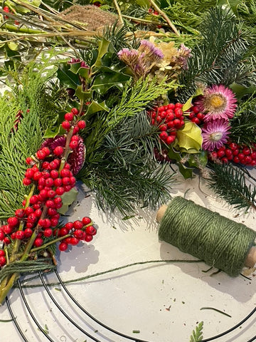 All the materials needed to create your wreath are provided: plant materials, wire wreath frame, and twine.